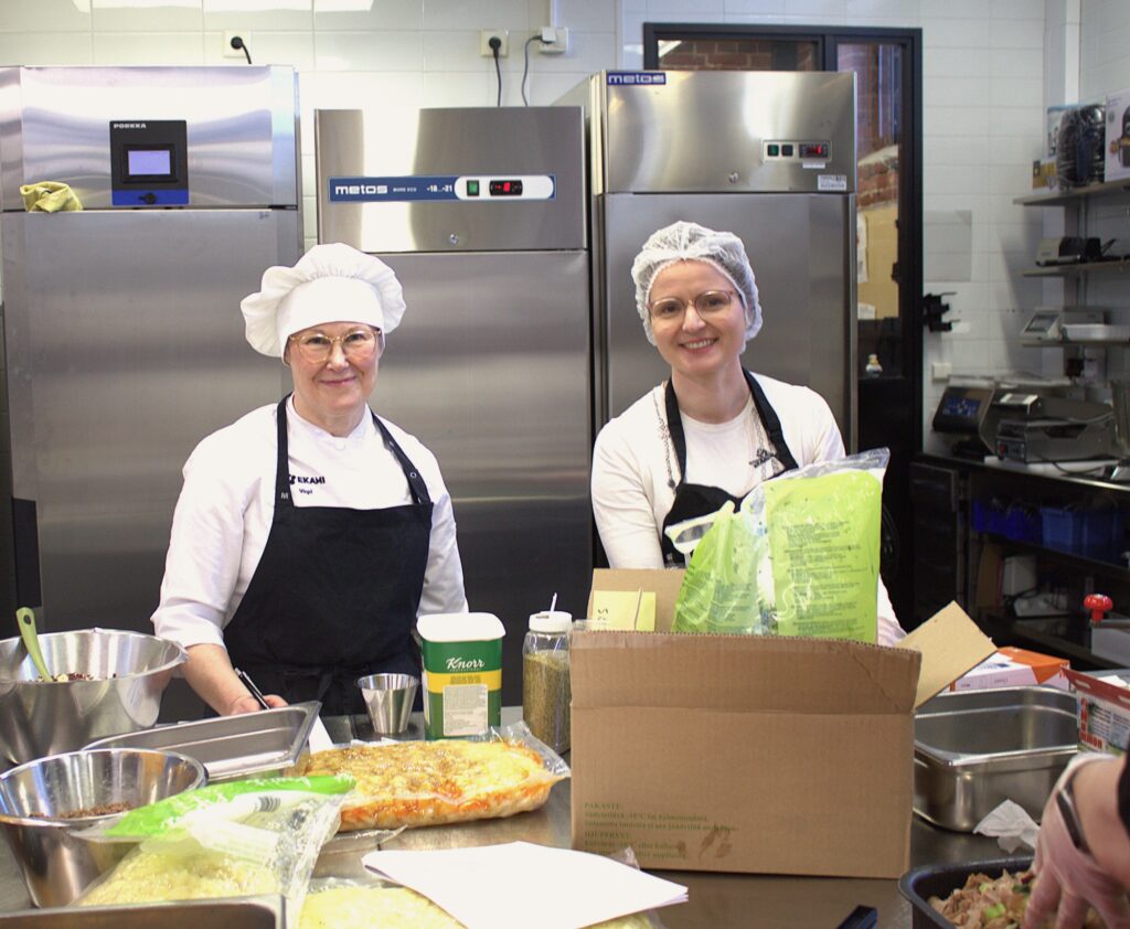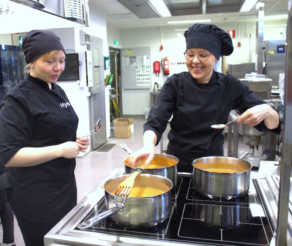Hyrian Susanna Laurila ja Anne Hujo iloisissa tunnelmissa XAMKIn Restolabissa